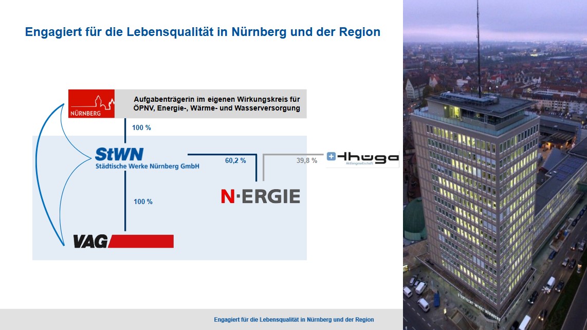 Die N-ERGIE Aktiengesellschaft, Nürnberg, zählt zu den großen kommunalen Energieversorgern in Deutschland und ist ein wichtiger Investor in der Region. Große Teile Mittelfrankens und angrenzende Bezirke versorgt sie mit Strom und Erdgas, die Stadt Nürnberg zusätzlich mit Wasser und Fernwärme. Diese Aufgabe begreift sie als Daseinsvorsorge. Deshalb macht sie sich für Klimaschutz und die Energiewende stark.